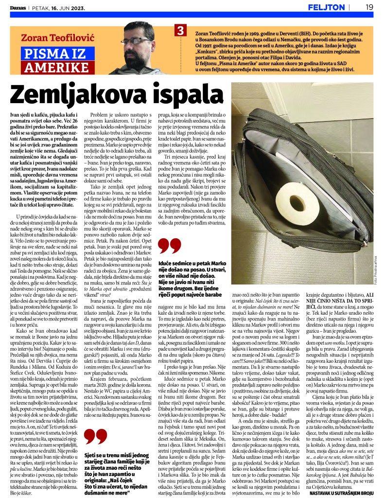 6 Decembra, 20236 Decembra, 2023 Prvo Lice Jednine Pisma iz Amerike (3) Treći nastavak iz serijala ” Pisma iz Amerike” objavljen u beogradskom dnevnom listu “Danas”. Podijeli ovaj Tekst: Share on X(Otvara se u novom prozoru) X Podijeli na Facebooku(Otvara se u novom prozoru) Facebook Lajk Učitavanje... Srodno